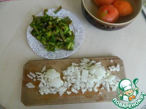 Мелко нарежем лук и чеснок, перец нарежем небольшими полосками. Помидоры зальем кипящей водой и оставим на несколько минут.