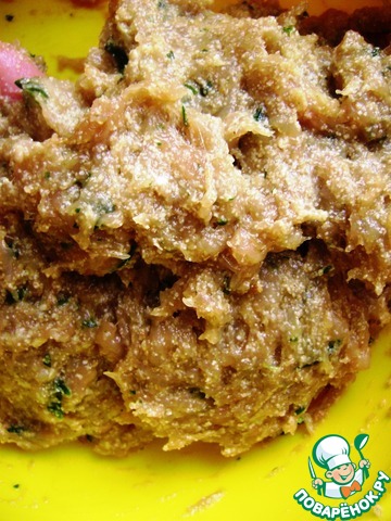 Посыпать сахаром и пряностями, понемногу вливая соевый соус, вымешать. Добавить кунжутное масло и еще раз перемешать. Фарш липкий, дать ему настояться с полчаса.