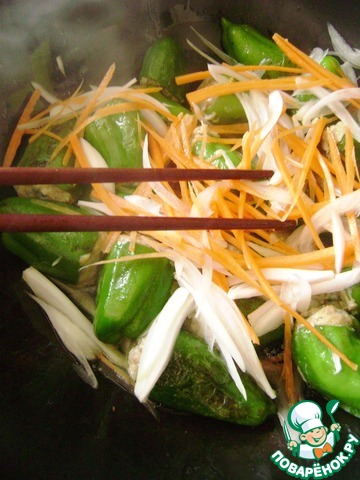Посыпать перчики тонко нашинкованными луком и морковью, жарить, помешивая, пару минут. Влить пару ложек воды, убавить нагрев и под крышкой потушить перцы минут 7.