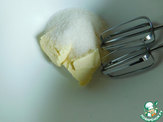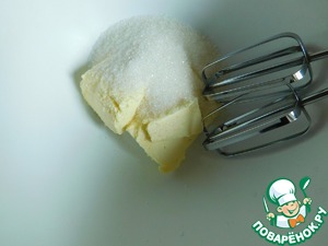 Взбиваем миксером в пышную массу размягчённое сливочное масло, сахар и ванилин.