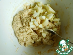 Два яблока чистим и нарезаем кубиками, добавляем их в тесто и снова перемешиваем.