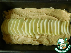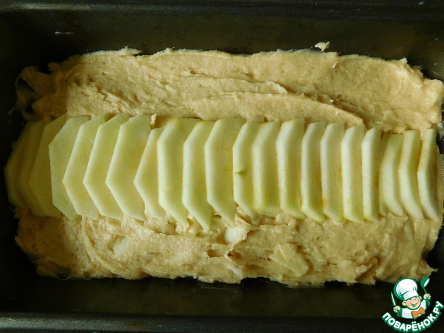 • Выкладываем тесто в подготовленную форму, разравниваем поверхность. Оставшееся яблоко чистим и нарезаем тонкими ломтиками.