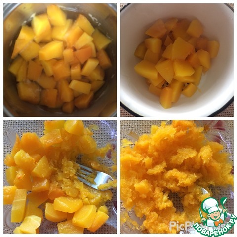 Готовую тыкву откидываем на дуршлаг, даем стечь всей жидкости. Остужаем, затем пюрируем - вилкой, либо блендером. -