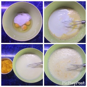 В миске взбиваем яйца с солью, сахаром, ванильным сахаром и разрыхлителем. Добавляем кефир, взбиваем, оставляем минут на 5. Добавляем к кефирной смеси тыкву, перемешиваем.