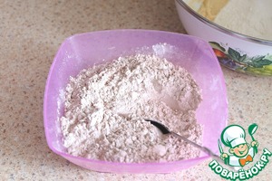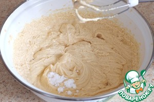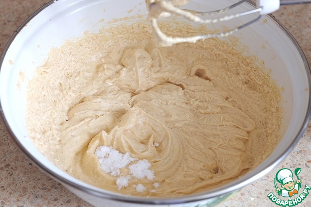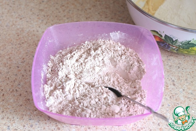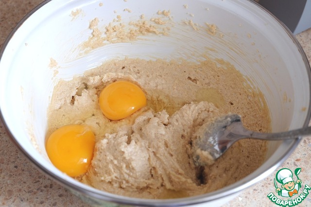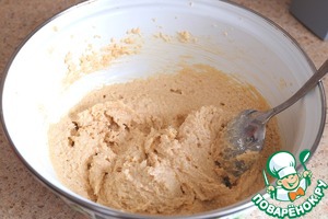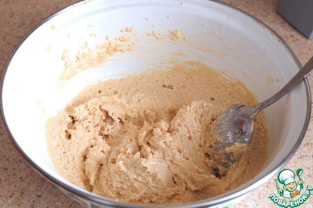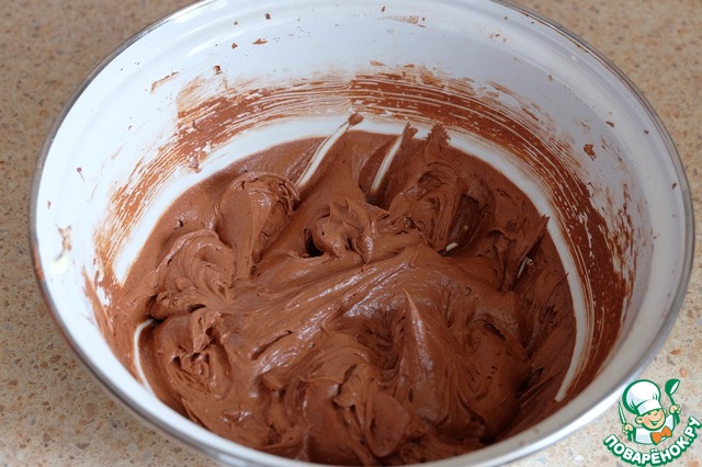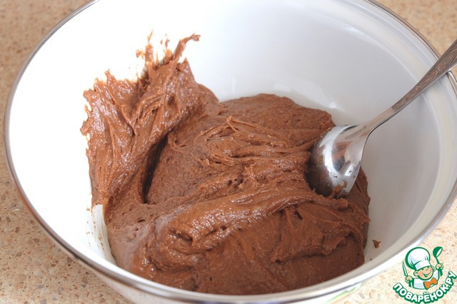 В масляную смесь добавить смесь муки и какао-порошка. Тесто хорошо размешать до однородной, гладкой консистенции.