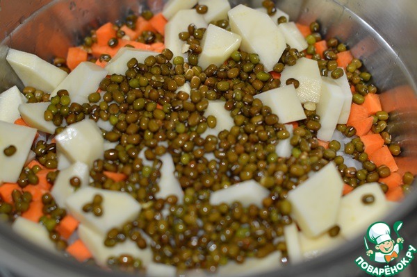 Затем снять крышку, влить немного горячей воды, регулируя густоту супа, дождаться пока суп начнет закипать, накрыть кастрюлю крышкой и снять с огня. Оставить на 20 минут.