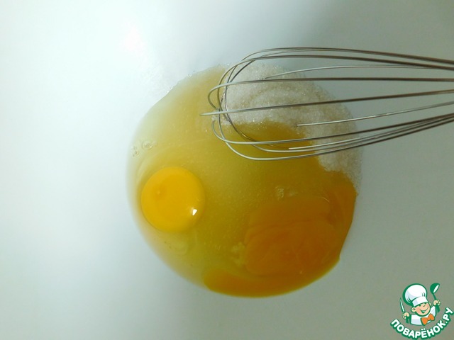 Смешиваем и слегка взбиваем венчиком яйца, ванилин и сахар. Продолжая взбивать, добавляем воду и добиваемся полного растворения сахара. -