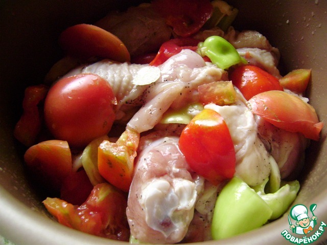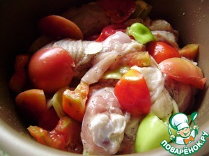 Помидоры, перцы и лук нарезаем крупно. Можно взять их столько, сколько любите. Добавляем голени. Солим, перчим и перемешиваем.