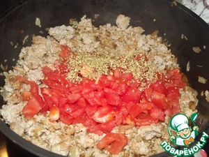 Помидоры очистить, нарезать и добавить к фаршу. Так же добавить Орегано по вкусу.