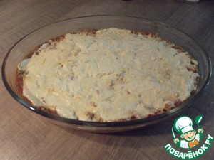 Спустя 15 минут достать запеканку из духовки и смазать её сметаной с сыром. После отправить все снова в духовку ещё на 15 минут, только в этот раз не закрывая.