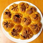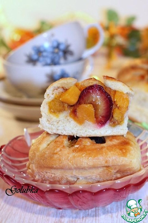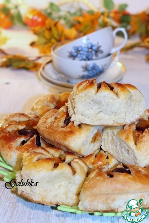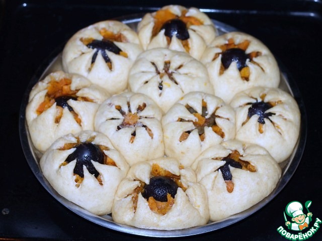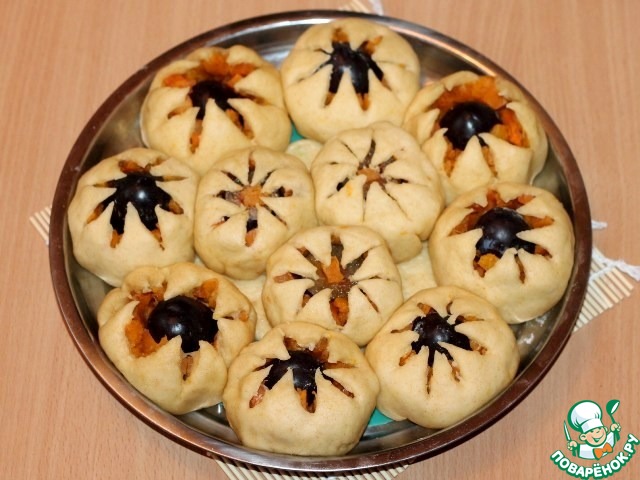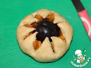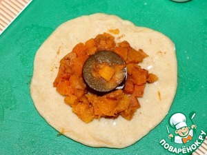 10. Затем каждую часть теста раскатываем в круг ~ Ф 12 см, немного припыляем крахмалом только середину круга и кладем половинку сливы и тыкву.