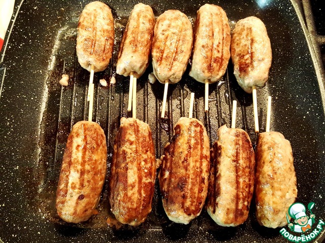 Руки смачиваем водой, и формируем котлеты в виде продолговатых колбасок, в один конец колбаски вставляем деревянную шпажку ( мой муж говорит, что это баловство, но детям очень нравится).