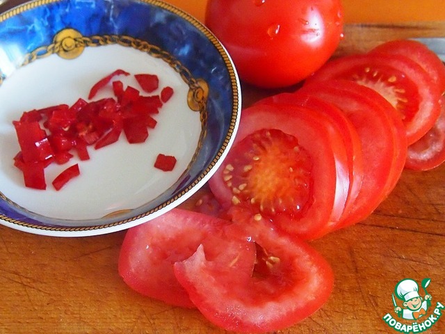 Помидоры нарезать кружками или дольками. Я бы рекомендовала все-таки брать не круглые помидоры, как у меня, а продолговатые и резать их вдоль длины на четыре части и раскладывать бочком, так их на пирог поместится больше и будет красивее выглядеть. Любители остренького могут добавить перчик-чили, очищенный от семян и мелко нарезанный.