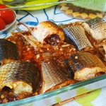 Лук с соусом, в котором мариновалась и тушилась/пеклась наша рыбка, можно перемолоть в блендере и подавать как самостоятельный соус.