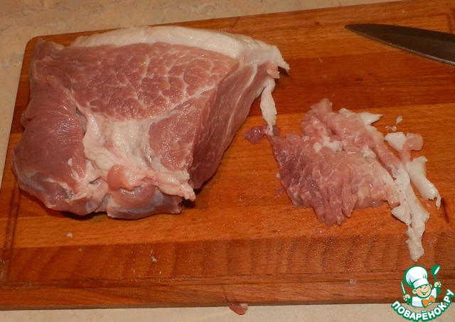 Свинину режем на полосочки примерно 0,5х5 см