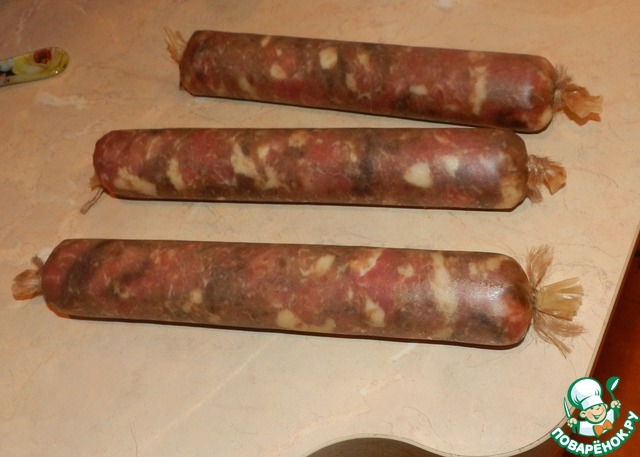 Помещаем батончики в холодильник часа на 3, что бы мясная масса "созрела", можно до суток - чем дольше лежит, тем вкуснее будет колбаса. -