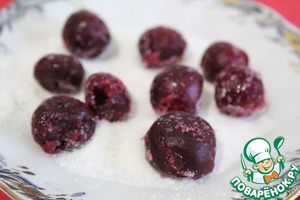 Крахмал смешиваем с 1 ст л сахара и опускаем в него вишню