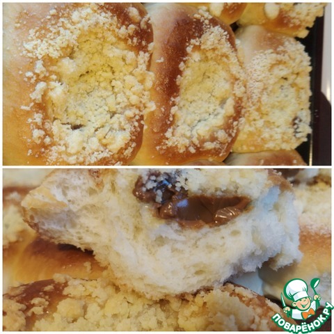 Очень люблю это тесто - минимальное количество дрожжей, выпечка из него получается невесомо-пушистая, очень вкусная, тесто подходит для любой выпечки - и сладкой и несладкой. Сегодня угощаю булочками с вишней и штрейзелем, и булочками с творогом и сулугуни (который оказался псевдо-сулугуни). Очень любим погонять чай с такой выпечкой! Если делаю много - храню в холодильнике и подогреваю в СВЧ - но долго не бывает))) Пробуем?