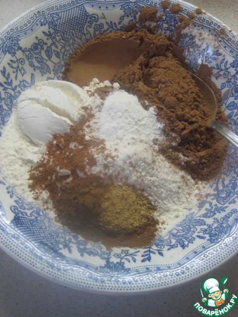 В отдельное миске смешиваем сухие ингредиенты - муку, соль, разрыхлитель теста, какао и специи: корицу, мускатный орех и имбирь.