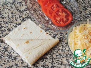 На край выложить кружок помидора, ст. ложку начинки, немного натертого сыра. -