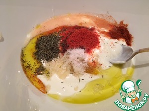 Приготовьте маринад:смешайте йогурт, тимьян, оливковое масло, паприку, винный уксус, соль, чили. -