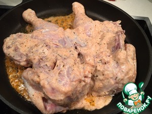 Возьмите сковороду и жарьте курочку под крышкой, на медленном огне. Каждый раз, когда вы будете переворачивать курицу, смазывайте одну сторону маринадом. -