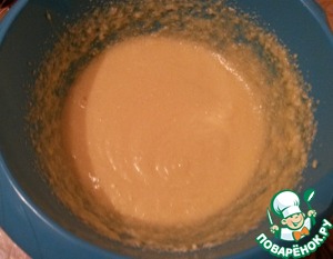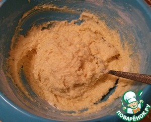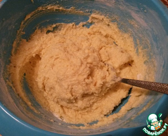 Затем всыпаем муку с щепоткой соли. Перемешиваем. По консистенции получается, как густая сметана.