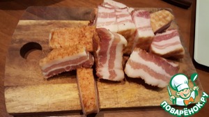 Провернуть всё в мясорубке с крупной сеткой. Тщательно вымешать фарш. Добавить чеснок, пропущенный через чеснокодавку, соль (учитывая солёность бекона), специи (я добавила перечную смесь) и коньяк.