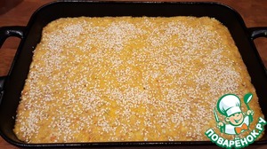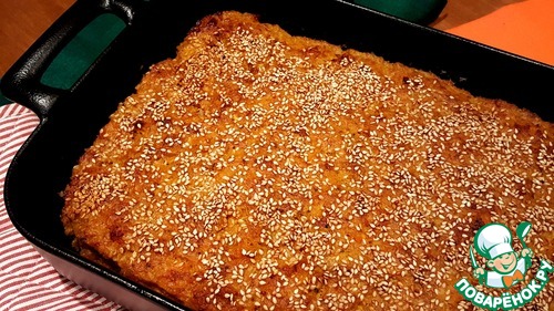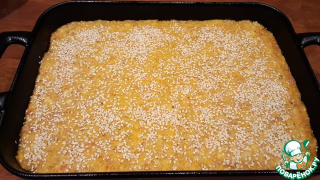 Смазать форму для запекания растительным маслом. Выложить фарш в форму. Включить разогрев духовки 200°. Посыпать запеканку кунжутом.