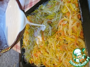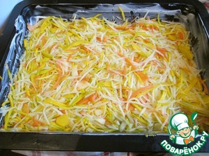 Первый слой - наши красивые овощи! выкладываем их ровным слоем. Не бойтесь и смело выкладывайте половину, так как основная начинка должна получится посерединке