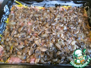 На фарш выкладываем обжаренные с луком грибочки и распределяем по поверхности