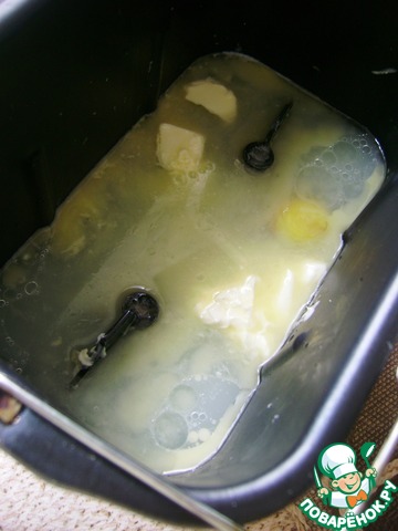 Рецепт для хлебопечки. Тесто получается мягким и липковатым. В ведерко хлебопечки выложить все жидкие компоненты, добавить творог. Масло я нарезаю кусочками.