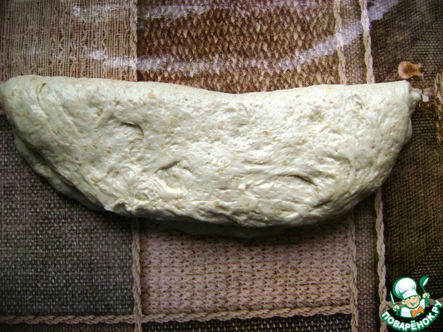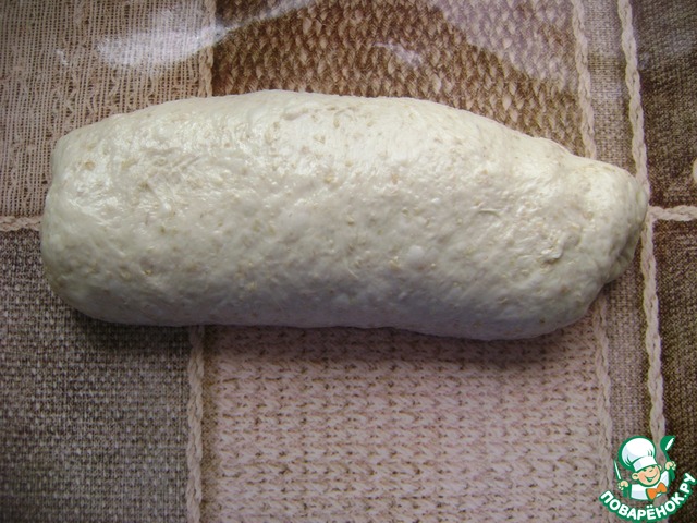 Расплющить подошедшее тесто в пласт и сформовать батон, свернув тесто втрое по длинной стороне. Повторить все со второй половиной теста.