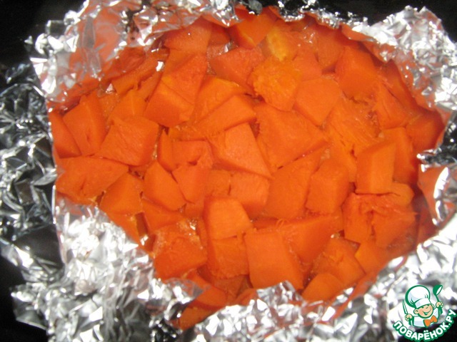Тыкву почистить, нарезать кусочками размером 1 см, запечь в фольге 40 минут при температуре 200 градусов. Остудить.