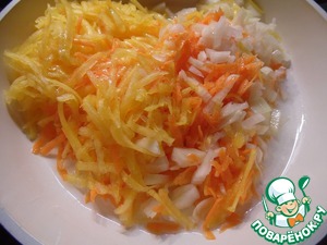 Лук нашинковать, чеснок измельчить, морковь и тыкву натереть на крупной терке.