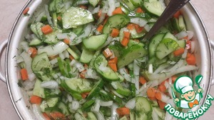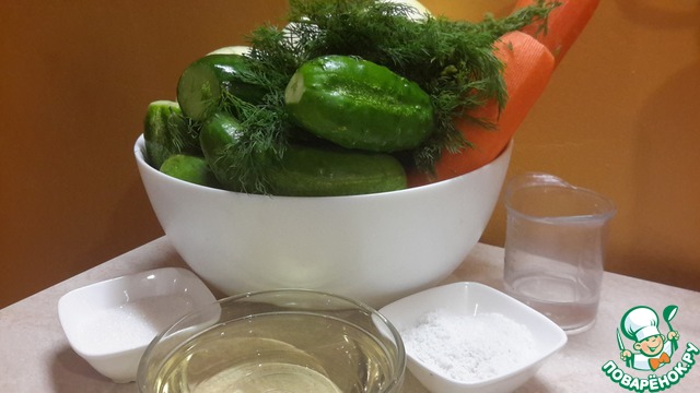 Режем овощи: огурцы - кружками, полу-кружьями или четвертькружьями, в зависимости от размера огурца. Морковь - кубиками. Лук -четвертушками. Укроп - просто мелко. Засыпаем-заливаем остальные ингредиенты: соль, сахар, масло, уксус.