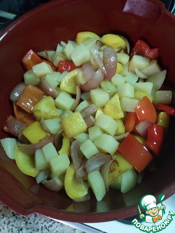 Лук нарезаем лепестками (сначала на четвертинки, потом каждую еще вдоль), болгарский перец квадратиками.