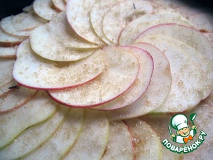 Смазать маслом форму ок. 22-24 см. Яблоки вымыть, очистить, вырезать середину и нарезать тонкими ломтями на слайсере. Сбрызнуть лим. соком, чтоб не потемнели. (Полезный совет: если у вас нет лимонного сока, то сделайте слабый солевой раствор и поместите резаные яблоки ненадолго в него – они не потемнеют, солеными тоже не станут). Выложить дольки произвольно на тесто.