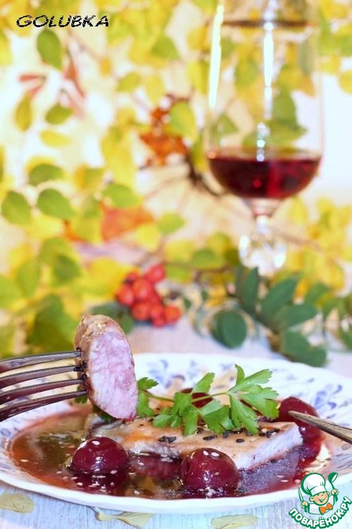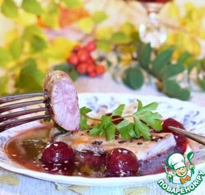 6. Снимаете соус с огня, удаляете палочку корицы и горячим поливаете стейки, выкладывая вишню. Украшаете листиком зелени. Хорошим гарниром к такому блюду станет салат из свежих или запеченных овощей.