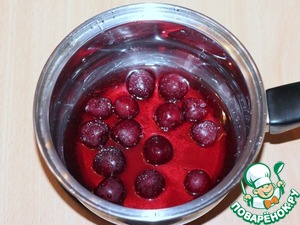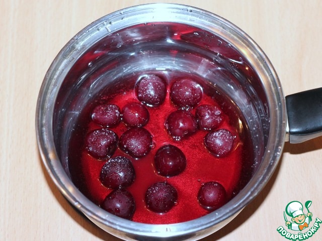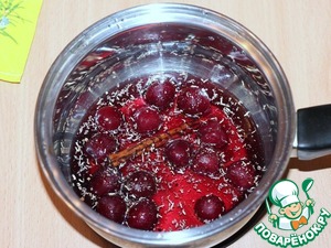 3. Приготовим ингредиенты для соуса. В небольшой сотейник выложить вишню, косточку удаляете. Добавляете вино, сахар и корицу.