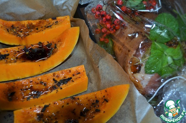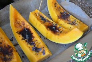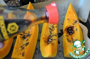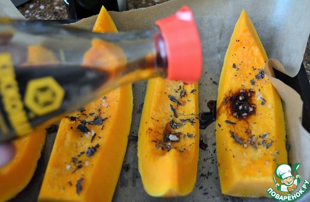 Для лучшего проникновения соуса и специй, проткнуть зубочисткой тыкву в нескольких местах. Сбрызнуть тыкву оливковым маслом.