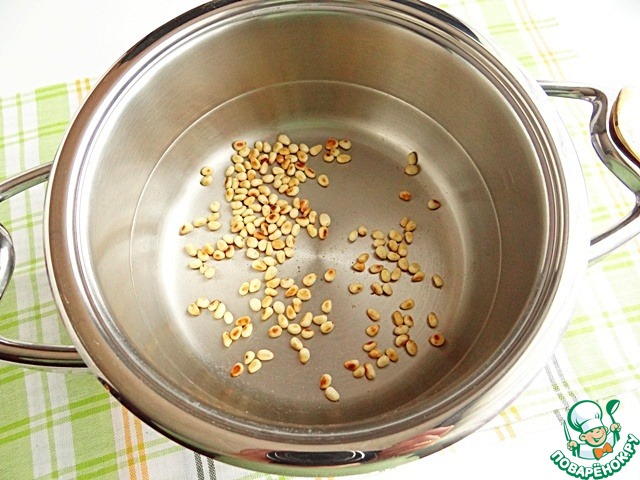 Кастрюлю Zepter нагреваю на плите, немного обжариваю на ней очищенные кедровые орехи.