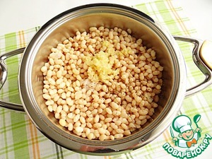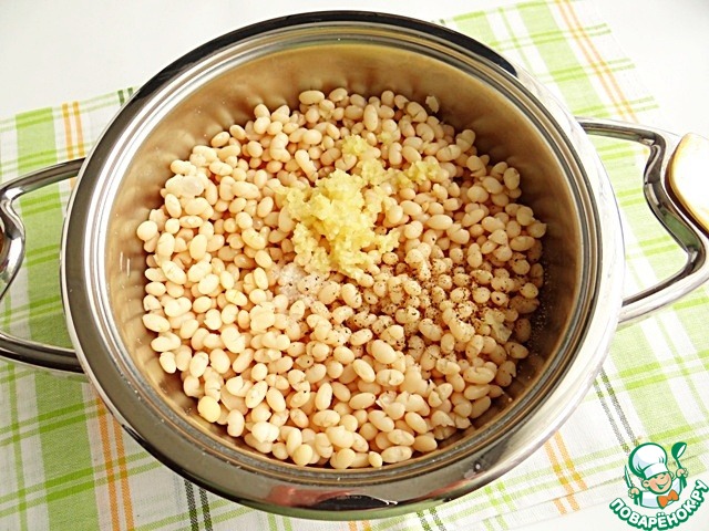 В сотейник с готовой фасолью добавляю соль и перец черный молотый по вкусу, пропущенный через пресс чеснок, оливковое масло.