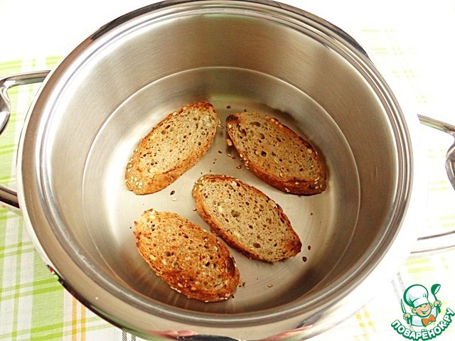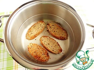 Немного обжариваю ломтики багета с двух сторон в разогретой кастрюле без масла.