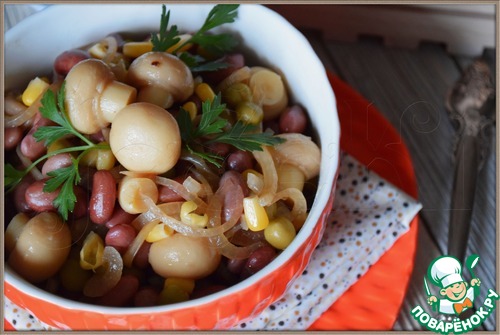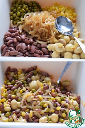 В чашку добавляем фасоль, отцеженную кукурузу, зеленый горошек и шампиньоны (если шампиньоны крупные, то режем их мелкими кусочками), добавляем лук, растительное масло и перемешиваем салат. Пробуем. При необходимости добавляем специи. Еще раз перемешиваем.