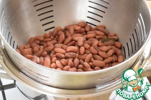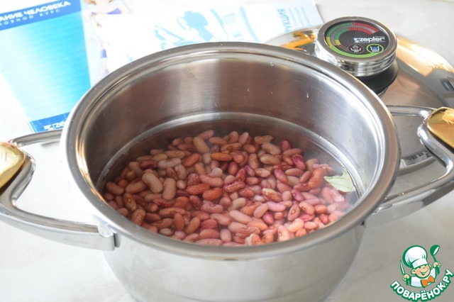 Фасоль промыть, выложить в кастрюлю, добавить воды 3 ст. (соотношение 1:2), лавровый лист.