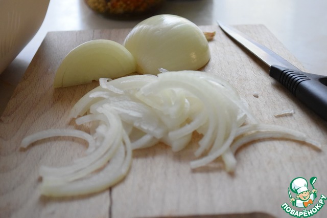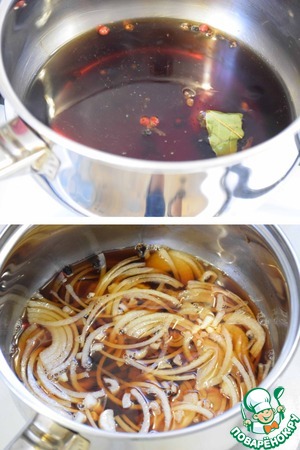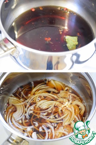 Проготовим маринад: в небольшую кастрюльку добавляем все ингредиенты для маринада, доводим до кипения и заливаем лук. Оставляем лук в маринаде на 1 час. Затем откидываем на дуршлаг и даем полностью стечь маринаду.