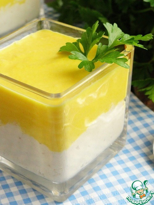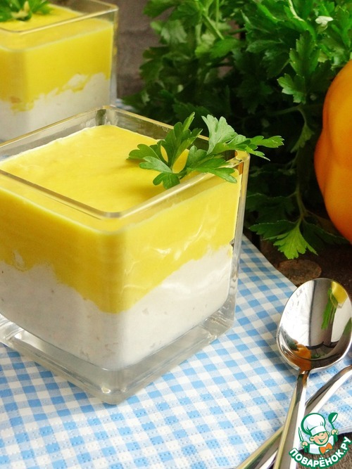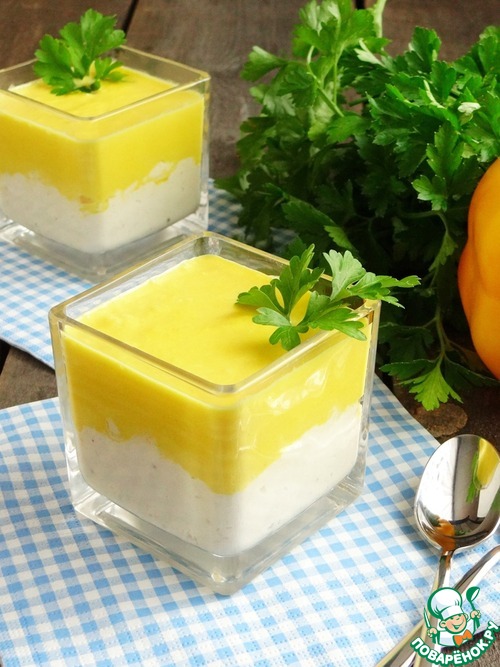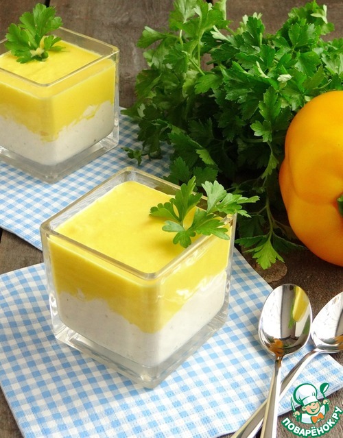 Выливаю массу из сладкого перца и сливок на рыбный слой. Немного охлаждаю закуску, украшаю зеленью петрушки. Закуска из трески и сладкого перца готова! Приятного Вам аппетита!