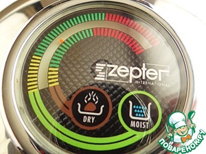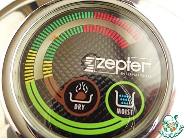 Сотейник закрываю крышкой и кладу на холодную плиту, включаю на самый маленький огонь (у моей электроплиты на переключателе 4 деления, поэтому я включаю на единицу). Даю стрелке термоконтроллера дойти до середины зеленого поля, затем отключаю плиту.