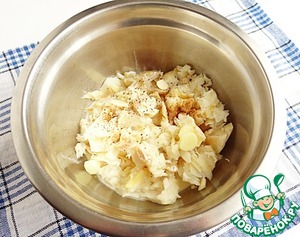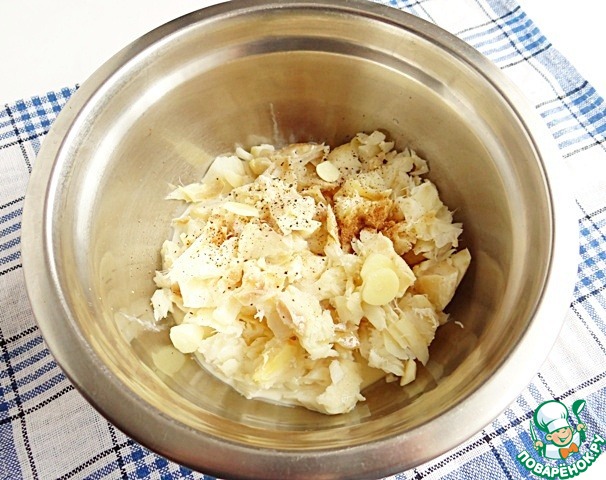 Филе трески выкладываю в миску, удаляю косточки, если они имеются, добавляю нарезанный чеснок, соль и перец черный молотый по вкусу, щепотку мускатного ореха, 250 мл сливок.